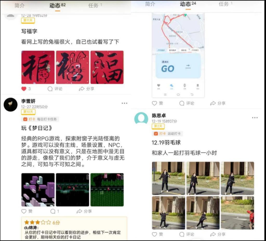 活动采用线上方式进行,从2022年12月18日到31日进行14天的小程序打卡。报名活动的同学通过微信小程序加入线上打卡小圈子。同学们可根据自己的意愿分别参加运动类和生活类的打卡。打卡过程中相关管理人员会根据每日打卡情况挑选一部分同学进行精选展示,打卡结束后由团委和员工会组成评委团最后评奖。