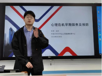 3月8日晚,球王会于三教408教室举办“心理危机早期筛查及预防”专题培训会。会议由球王会官网心理健康教育中心尚文老师主讲,公司心理互助会,预科生、本科生、研究生全体班委、寝室长等人员参加了培训。