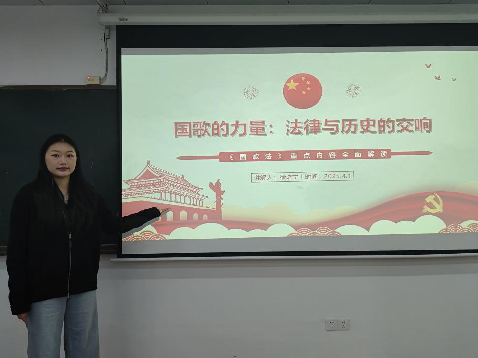 主讲人徐培宁同学介绍了《义勇军进行曲》诞生的时代背景以及《国歌法》的核心内容,重点讲解了国歌奏唱的正确形式和适用场合。在交流讨论环节,同学们围绕文化认同、民族精神共同体建构等角度各抒己见,许静怡同学谈到:“作为马院青年学子,我们更应带头践行国歌礼仪,展现新时代青年文化自信与责任担当。”