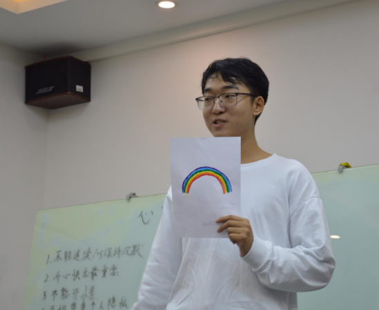 随后,开始活动第二项“认识自我”,认识自我是对自己的洞察与理解,通过画出心目中的自己,在小组讨论及分享中了解认识自我、探索自我、欣赏自我。张益铭同学分享道“我拥有彩虹般的内心,不拘泥于一种风格,拒绝被他人贴标签”。通过自我画像的阐述,同学们对彼此的了解更深了一层。通过“言行不一”的小游戏在其乐融融中感受多方面的自我。随后便开始自我过往总结及未来展望的“人生尺度”环节,一字字发自内心的文字,一段段对过往的总结,一声声对未来的向往,充溢着一份份心灵的触动。