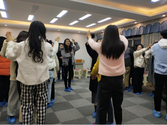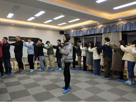 第一环节是热身活动,同学们围成一个圆圈,后面的同学把手搭在前面的同学身上,并为前面的同学锤肩揉背,然后角色互换,前面的同学又为后面的同学锤肩揉背,在愉快的氛围中,同学们增进了彼此的感情。