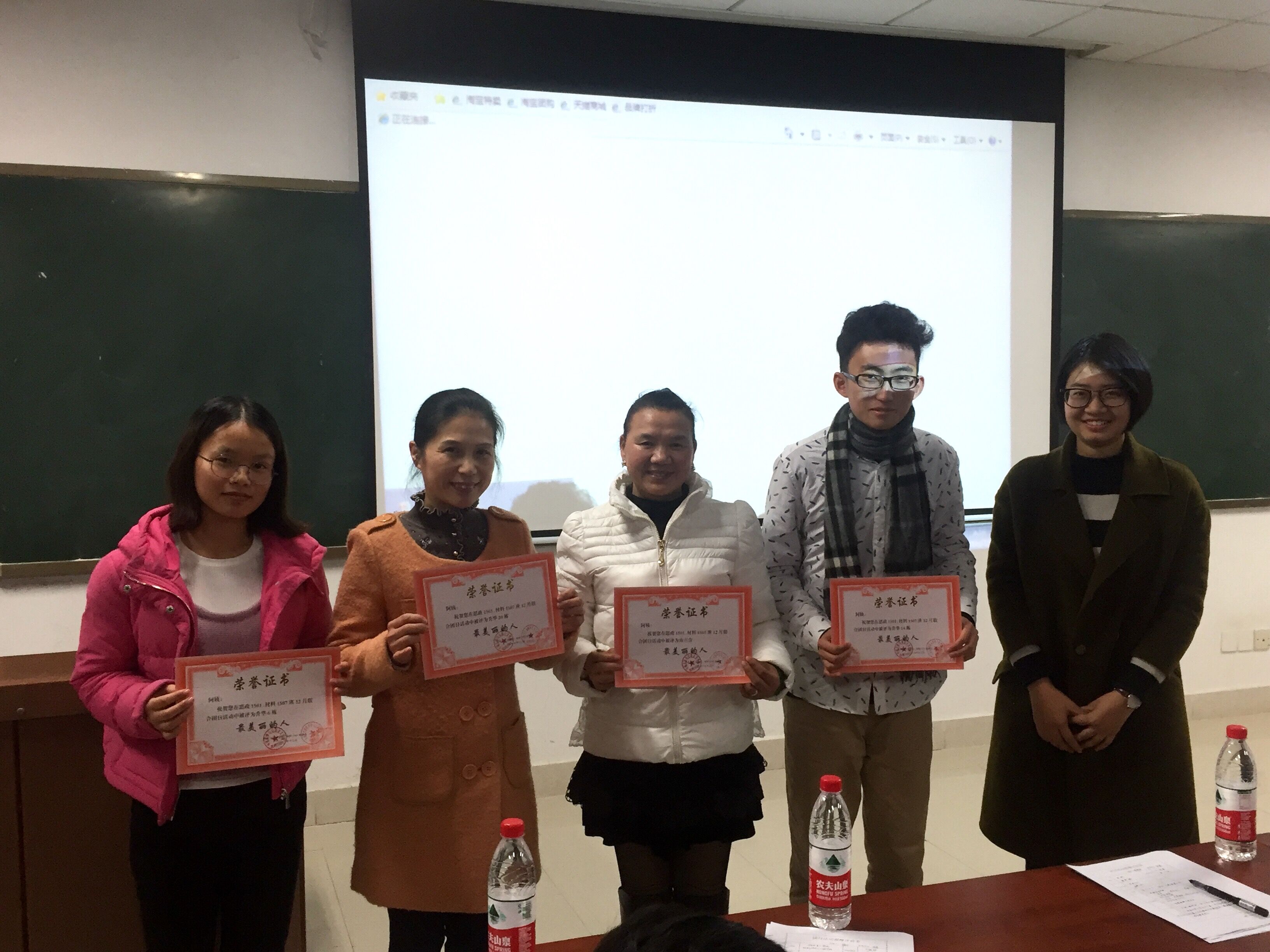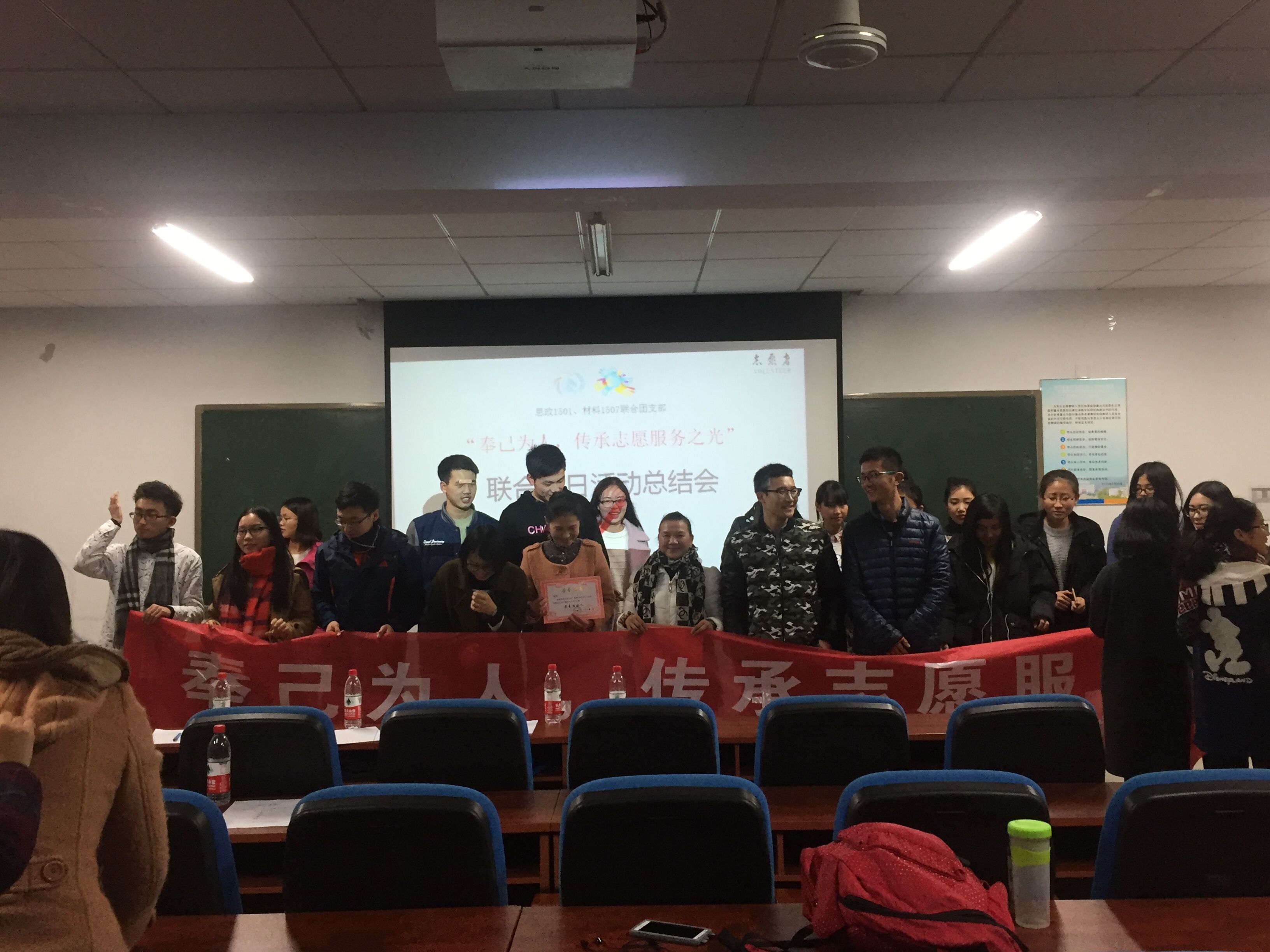 2016年12月19日晚七点,思政1501班及材料1507班联合团日活动总结大会在三教403召开,到场的除了思政1501班及材料1507班全体同学外,还有受邀前来的升华公寓宿管阿姨代表,校团委组织部活动管理中心的四位观摩人员以及球王会团学会副主席和材料院团学会组织部长等人。
