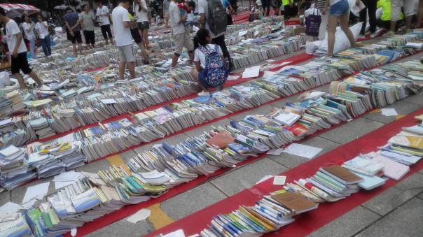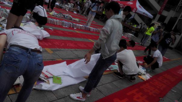 在活动当天,员工助理们一大早便将所有书籍搬往二食堂前坪,并细心地分类整理书籍以便同学们查找所需。尽管当日天气炎热,现场气氛却是异常火爆,领书的同学络绎不绝,十分热闹。