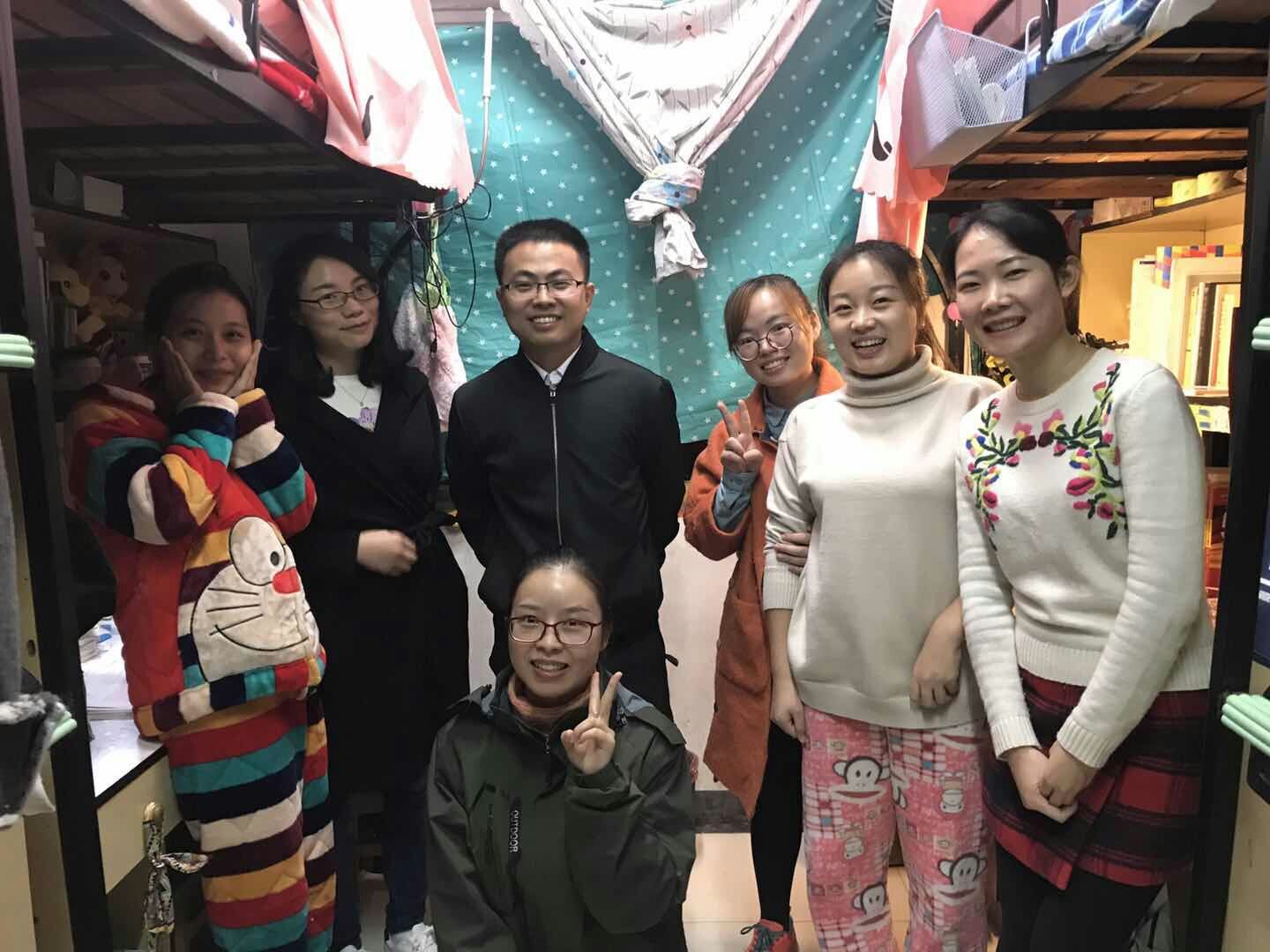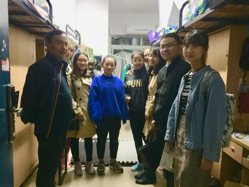 在寝室,众位老师对新生的生活情况尤其关注,秘老师与邹老师叮嘱同学们,近来长沙大幅降温要注意保暖以防感冒,早课尽量不要迟到,上课一定要带校园卡刷卡上课,并关切询问研究生近来状况,探讨就业与发展问题。同时,刘老师与铁木尔老师也格外关心预科生近来的学习生活情况,对预科生的寝室整洁情况提出了表扬,并鼓励他们尽快适应老员工活,调整好状态,生活或学习上有任何困难及时向老师们反映。