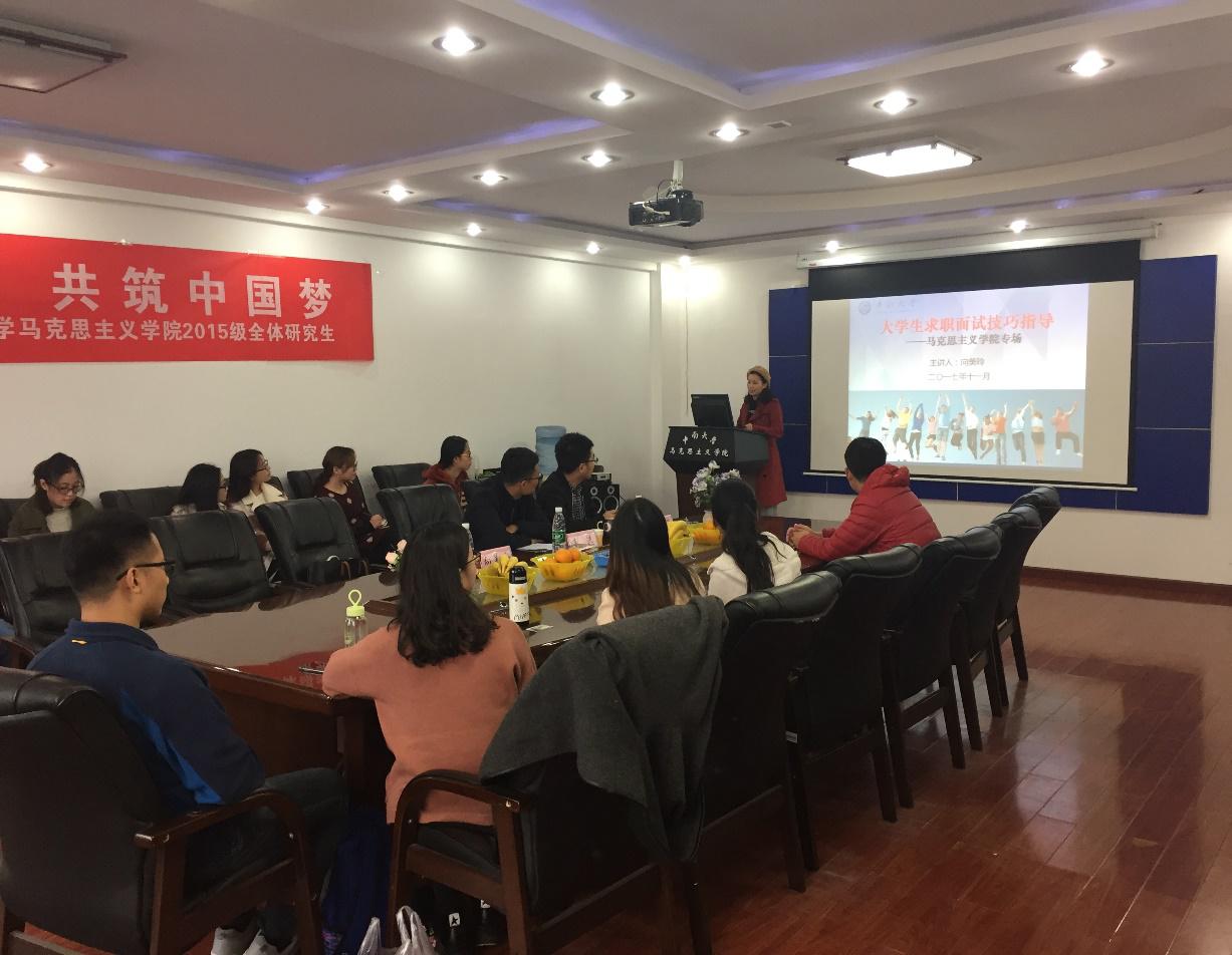 首先,秘老师对莅临本次交流会的两位老师进行了详细介绍,并特别感谢两位老师百忙之中来到马院为员工传经授宝,同时希望同学们在此次交流会中认真学习,为自己的求职道路做好充分的准备。