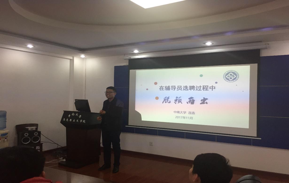 航空航天公司连选老师为同学们讲述辅导员选聘的求职要点。连选老师通过自身参加辅导员技能大赛的实例为我们讲述辅导员选聘过程中的注意事项。第一、要充分熟知复习资料和相关文件,以便在笔试过程中能脱颖而出;第二,他通过个人参赛实例为我们解答笔试中的答题思路;第三、连老师对如何应对辅导员选聘中的案例分析试题进行了详细讲述,其生动幽默的言语博得同学们阵阵掌声。