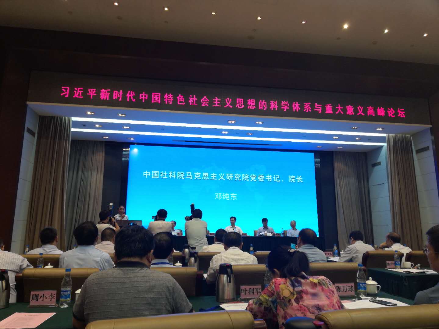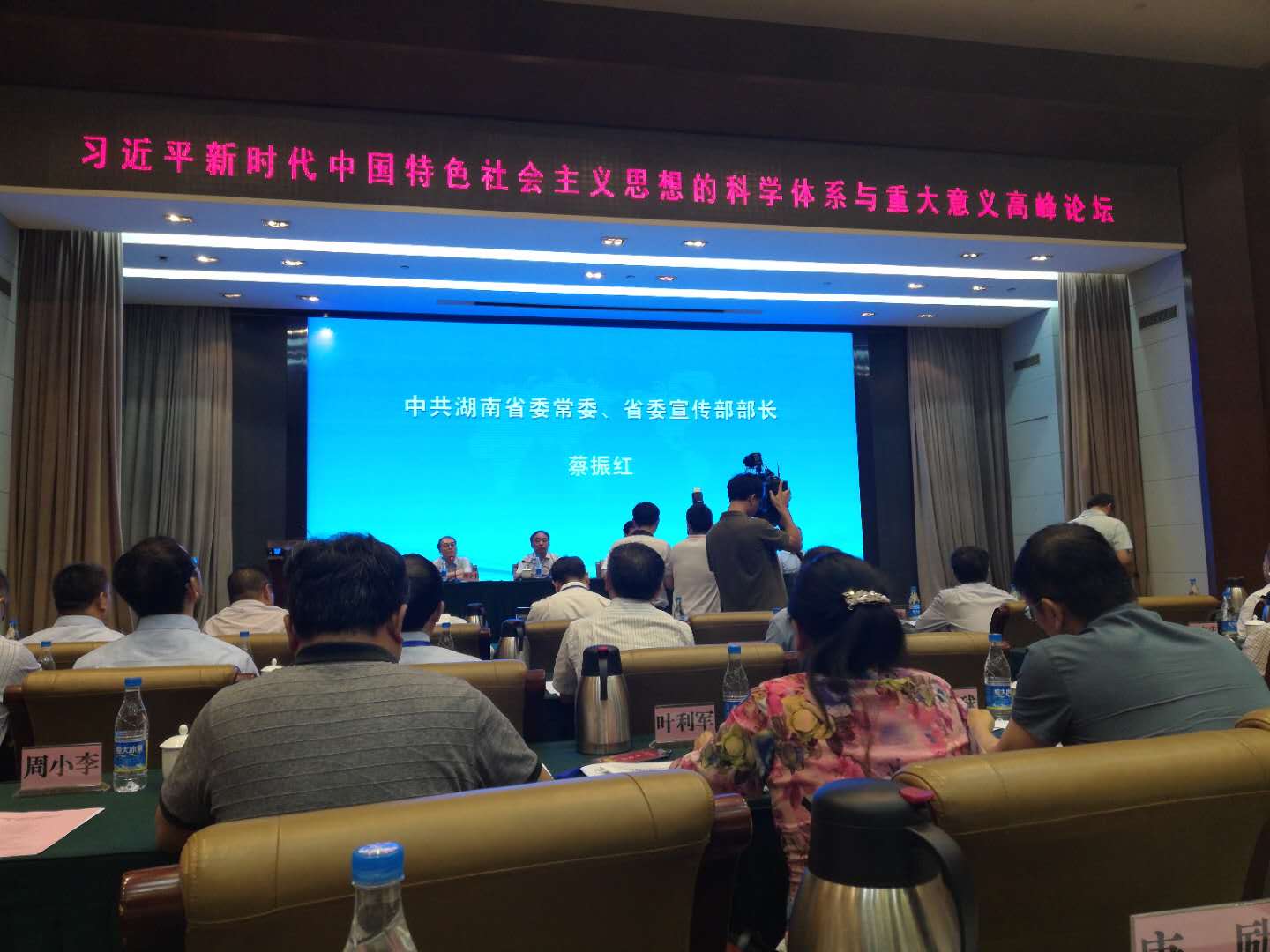 在随后召开的“习近平新时代中国特色社会主义思想的科学体系与重大意义”高峰论坛上,湖南省社科公司党组书记、经理刘建武、中国社科院马克思主义研究公司党委书记、经理邓纯东先后致辞,中共湖南省委常委、宣传部长蔡振红发表重要讲话。来自《中国社会科学》杂志社、清华大学、中国社科院、《求是》杂志社、湖南大学、湘潭大学、湖南师范大学、广州大学、湖南省社科联的9位专家先后作主旨报告。在学术研讨阶段,来自中国社科院、人民出版社、华中师范大学、西藏民族大学、浙江财经大学、武汉音乐公司、清华大学的9位学者作大会交流发言。公司刘方平老师提交的学术论文《人类命运共同体:开启全球治理新时代》入选本次高峰论坛《论文摘要集》。