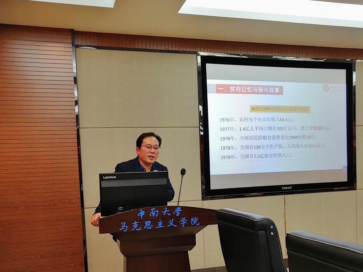 最后,湖南商公司刘兴云老师围绕“改革叙事:集体记忆与意义赋予”分享了改革开放的个人体验。刘老师幼时家境贫寒,且亲身经历了改革开放前后的发展变化。刘老师声情并茂的讲述,使同学们感受到了不一样的改革开放体验。一方面,刘老师介绍了“贫穷记忆与奋斗叙事”,从成分记忆与伤痕叙事、运动记忆与转型叙事等方面介绍了改革开放后人民衣食住行的巨大变化;另一方面,刘老师就“都市变迁的空间叙事”进行了讲述,阐释了改革开放中城市变迁与市民生活方式的改变等。同时,刘老师勉励同学们要铭记历史,感恩改革,感恩时代,并指出“不努力是不行的”,要积极进取、努力奋斗、砥砺前行。