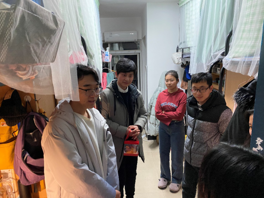 首先来到是升华员工公寓20栋的七间女生寝室。班导师李老师和辅导员陈老师依次对每一间寝室进行探访,询问同学们期末复习情况。两位老师从同学们对老员工活的期望和憧憬出发,引导每一位同学要确定一个符合实际的总体目标、要制定一个切实可行的个人计划、要做出一系列实实在在的行动;希望每一位同学通过自己的努力,能够获得一份满意的成绩。在整个过程中,老师们深切表达了对同学们的关心并且给每一位同学都带来了惊喜大礼包。