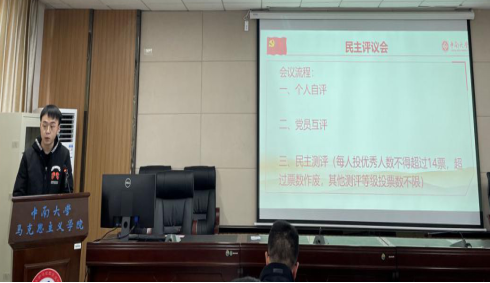 会议第二项,举行民主评议会。支部本着实事求是、民主公开、坚持平等的原则,根据支部党员数量情况,分成5个小组分别在403、407、518、520、609进行个人自评、党员互评和民主测评。党员们首先从参加党的组织生活、坚定理想信念、严守党的纪律、践行党的宗旨、转变工作作风、履行党员义务、发挥先锋模范作用等方面,查找自身问题,开展自我批评。其次党员相互评议,党员个人自评之后,其他党员随即对其进行相互评议,提出批评建议和改进措施。随后开展民主测评,对支部党员进行投票测评,监票人、计票人统计民主测评结果。经统计秘金雷、徐敏、袁玉勤、龚珊、蒋宙澄、查云龙、彭汉玉、尹诗慧、何秋娟、张维超、刘亚萍、王丹、李京结、陈一鑫等14位同志民主测评结果为优秀。