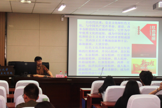 曾教授以红色文化为切入点,以时间为脉络,分阶段给同学们讲述中国共产党发展历史,引发同学们深思。通过详实的史料,充分展现中国共产党百年来铸就的精神长城。曾教授讲到“红色文化具体包括共产党百年铸就的红船精神、井冈山精神、苏区精神、长征精神、延安精神、红岩精神……抗火抗震抗疫精神”,这些精神一直激励着一代又一代中国人不断前进,成为中国人前行的动力。
