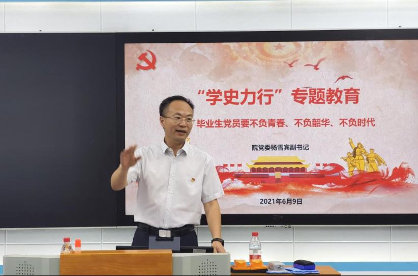 活动第一项内容为党史学习教育。杨雪宾书记围绕“党史力行”这一主题,强调毕业生党员要不负青春、不负韶华、不负时代。首先要通过广泛学习各种书本知识和常识来充实自己,跟上“知识更新”的时代步伐,既要广泛涉猎,又要突出重点,丰富了理论知识,在实际操作中才能运用自如。其次是要牢记总书记对青年人的要求和希望,把不忘初心、牢记使命落到实处,以自身所学讲好中国故事,为中国特色社会主义事业作出贡献。