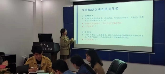 接着,团委组织部部长刘源同学讲述智慧团建系统的操作。通过具体的流程展示,刘源同学详细地向我们展示了智慧团建的运用,解答与会团支书在流程操作方面的疑惑,便利今后各项工作的开展,提升了智慧团建系统的应用率。