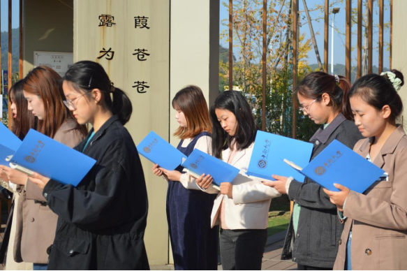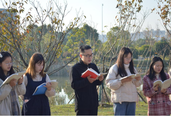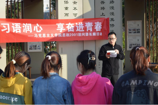 在11月13日上午,为全面解读习近平总书记的讲话精神,鼓励青年员工积极担当起作为思政工作者的责任与使命,作为指导老师的胡文根老师以及思政2001班全体同学在问渠长廊举办了本次以“读习语润心,享奋进青春”为主题的分享会。活动由思政2001班组织宣传委员范雪倩同学主持。