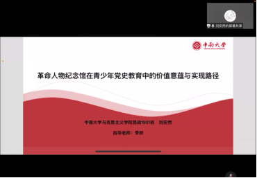 刘安然同学在季娇老师指导下,以《革命人物纪念馆在青少年党史教育中的价值意蕴与实现路径》为题目在中国青少年发展论坛分论坛进行受邀报告。该会议由中国青少年研究中心、中央团校、中国青少年研究会举办,来自中央团校、中国青少年研究中心、清华大学、武汉大学球王会、华中师范大学球王会等的专家学者与会指导。刘安然同学从新时代青少年的特性与传统党史教育模式之间的现实脱节出发,探索革命人物纪念馆在青少年党史教育中的价值意蕴、基本特征与实现路径,对于提升青少年党史教育效果具有意义。