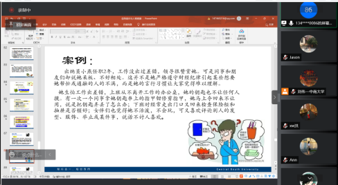 最后,课程负责人叶湘虹老师详细讲解了本课程的课程安排、在线论坛答疑安排、线上线下周次安排、在线教学预案等。强调了本课程教学重要目标之一是教员工学会自助预防、寻求帮助、关注他人,树立“自己是心理健康的第一责任人”的意识,即员工通过学习本课程,能够在遭遇心理问题时,有意识去寻求资源,帮助自己;同时,能够有意识去发现身边人遭遇的心理问题,并协助他们去需求帮助。