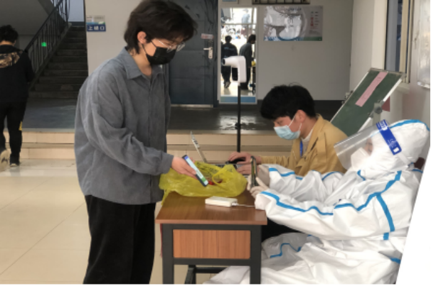 其中,老师们分工明确,高效有序。肖艳玲老师整体部署;陈力瑞老师负责提前联系南五舍宿管,拿到南五舍住宿同学们的名册,在检测当天进行核酸人数清点;彭汉玉老师、库都斯同志等通知每一层的同学们按照先后次序到一楼门口进行监测;肖艳玲老师和叶尔波拉提老师对排队的员工进行健康码检查和排队引导,保持排队时全程佩戴好口罩并保持 1 米以上间隔,不交谈、不聚集。学工办老师和党员们尽其所能,努力配合核酸检测人员和核酸志愿者的需要,为南五舍核酸检测提供最大的便利。