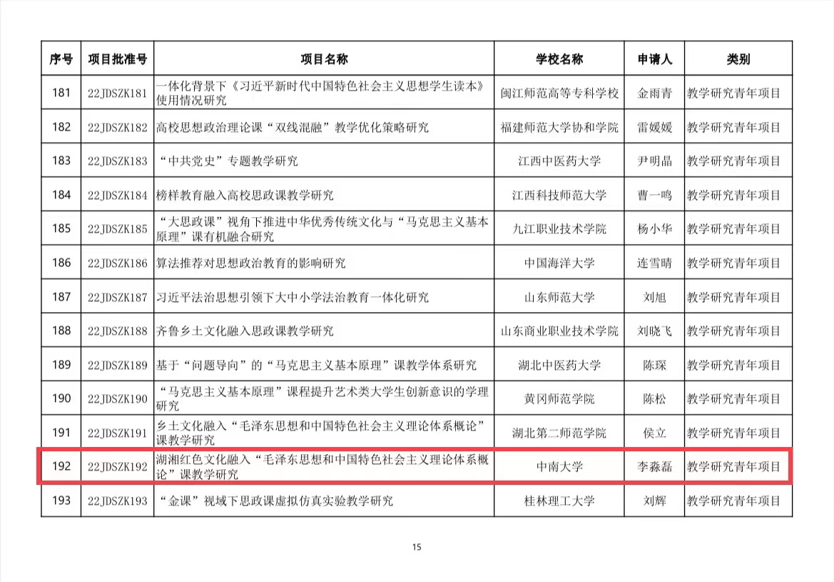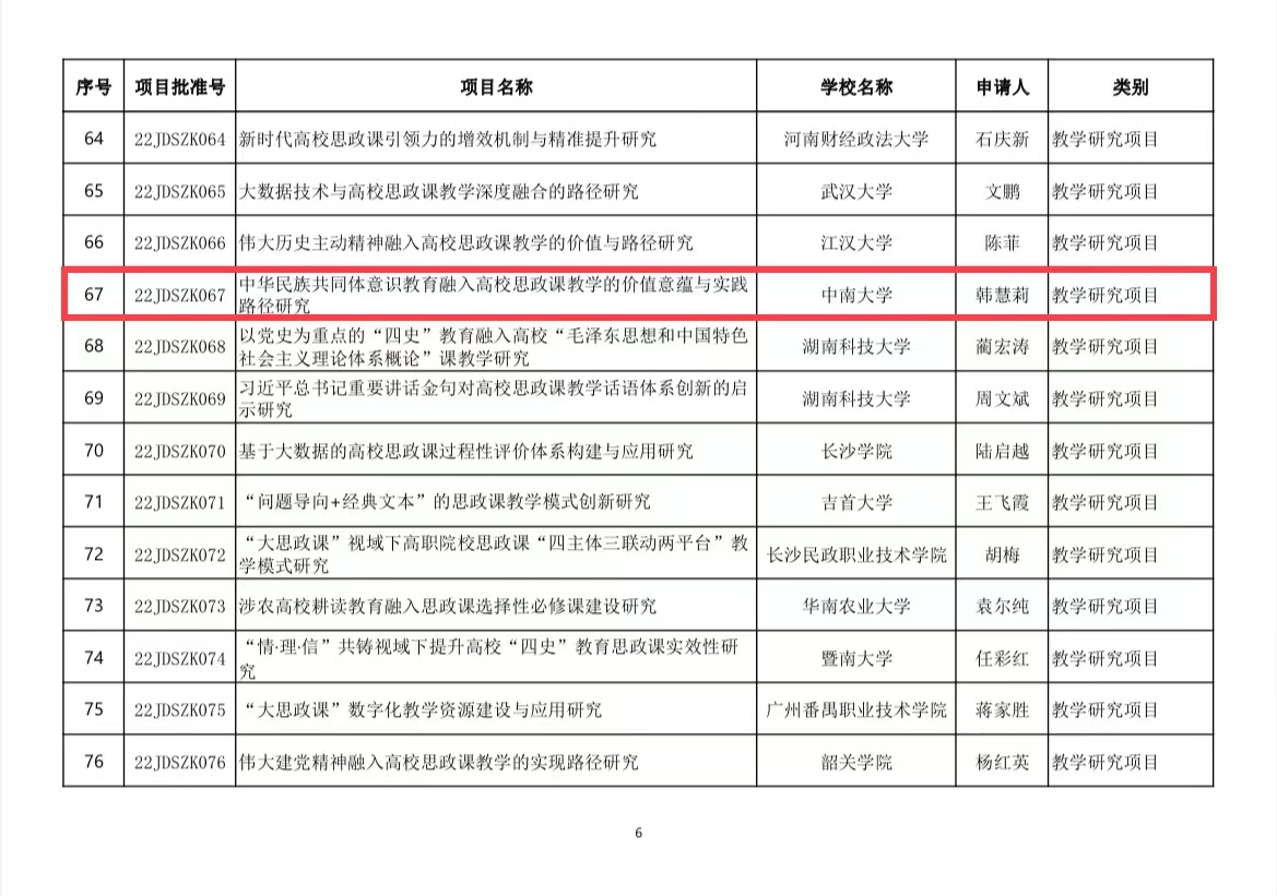 近日,教育部社会科学司组织的关于2022年度高校思想政治理论课教师研究专项一般项目立项结果公示,公司韩慧莉副教授主持申报的“中华民族共同体意识教育融入高校思政课教学的价值意蕴与实践路径研究”项目获得“教学研究项目”立项,李淼磊讲师主持申报的“湖湘红色文化融入‘毛泽东思想和中国特色社会主义理论体系概论’课教学研究”项目获得“教学研究青年项目”立项,曾安琪讲师主持申报的“面向碳中和的金属-能源-碳关键机制与管理策略研究”项目获得教育部人文社科青年基金项目立项。
