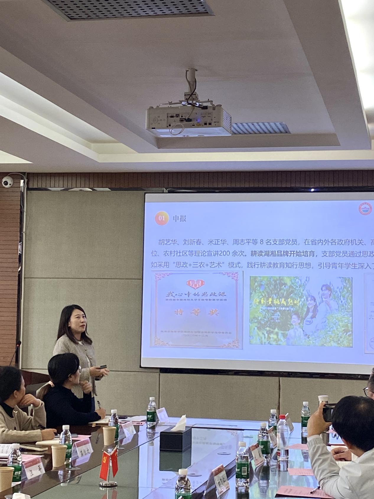 随后,湖南农业大学马院教工第二党支部书记蒋慎之老师为大家带来精彩分享。蒋老师所在支部先后入选了全省高公司党组织“对标争先” 建设计划样板党支部和全国党建工作样板党支部培育创建单位,她以王国维谈读书的“三重境界”为引,结合全国样板党支部申报、建设和验收的过程,详细介绍了支部在组织生活创新、品牌建设中持续锤炼“马+农”特色的经验做法,以及“三融三促”党建工作机制下支部在教学、科研和社会服务方面取得的实践成效。