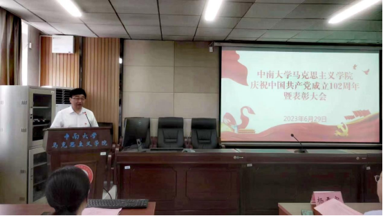 受表彰党支部和党员代表进行了发言。思想道德与法治教研中心党支部书记刘勇为感谢公司党委给予支部的指导和关怀,表示支部将珍惜荣誉、再接再厉,团结带领支部党员坚定理想信念,坚守政治立场,落实好立德树人根本任务。教师代表丁果从中国共产党的百年奋斗历史出发,强调党员要立足本职,以实际行动践行入党初心。员工代表李晨辉表示马院员工要勇担重任,在学习工作中坚定信念、提升能力。微党课竞赛获奖代表李淼磊号召中南马院人将主题教育“学思想、强党性、重实践、建新功”的总要求贯穿始终,将学习成效转化为工作动能,勇立时代潮头、勇担育人使命。